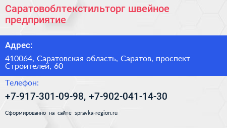 Саратовоблтекстильторг, швейное предприятие по адресу 410064, Саратовская область, Саратов, проспект Строителей, 60 в дальнейшем Организация, размещена в следующих категориях: