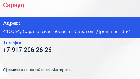 Сарвуд по адресу 410054, Саратовская область, Саратов, Дровяная, 3 к1 в дальнейшем Организация, размещена в следующих категориях: