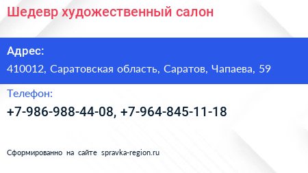 Шедевр, художественный салон по адресу 410012, Саратовская область, Саратов, Чапаева, 59 в дальнейшем Организация, размещена в следующих категориях: