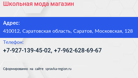 Школьная мода, магазин по адресу 410012, Саратовская область, Саратов, Московская, 128 в дальнейшем Организация, размещена в следующих категориях: