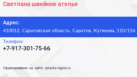Светлана, швейное ателье по адресу 410012, Саратовская область, Саратов, Кутякова, 110/116 в дальнейшем Организация, размещена в следующих категориях: