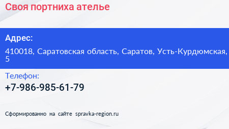 Своя портниха, ателье по адресу 410018, Саратовская область, Саратов, Усть-Курдюмская, 5 в дальнейшем Организация, размещена в следующих категориях: