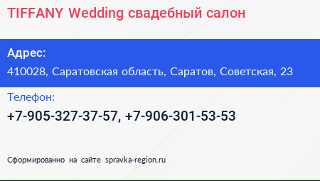 TIFFANY Wedding, свадебный салон по адресу 410028, Саратовская область, Саратов, Советская, 23 в дальнейшем Организация, размещена в следующих категориях: