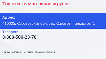 Toy.ru, сеть магазинов игрушек по адресу 410005, Саратовская область, Саратов, Танкистов, 1 в дальнейшем Организация, размещена в следующих категориях: