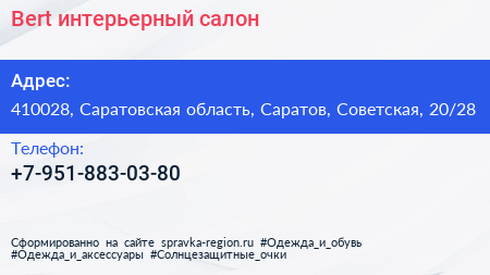 Bert, интерьерный салон по адресу 410028, Саратовская область, Саратов, Советская, 20/28 в дальнейшем Организация, размещена в следующих категориях: