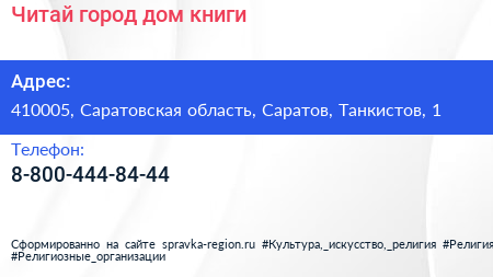 Читай-город, дом книги по адресу 410005, Саратовская область, Саратов, Танкистов, 1 в дальнейшем Организация, размещена в следующих категориях: