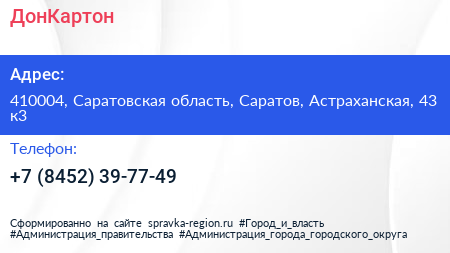 ДонКартон по адресу 410004, Саратовская область, Саратов, Астраханская, 43 к3 в дальнейшем Организация, размещена в следующих категориях: