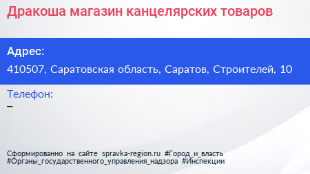 Дракоша, магазин канцелярских товаров по адресу 410507, Саратовская область, Саратов, Строителей, 10 в дальнейшем Организация, размещена в следующих категориях: