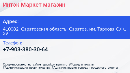 Интэк-Маркет, магазин по адресу 410082, Саратовская область, Саратов, им. Тархова С.Ф., 39 в дальнейшем Организация, размещена в следующих категориях: