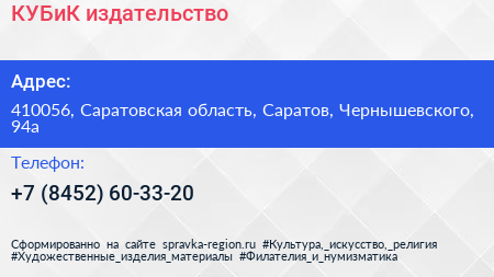 КУБиК, издательство по адресу 410056, Саратовская область, Саратов, Чернышевского, 94а в дальнейшем Организация, размещена в следующих категориях: