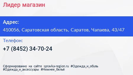 Лидер, магазин по адресу 410056, Саратовская область, Саратов, Чапаева, 43/47 в дальнейшем Организация, размещена в следующих категориях: