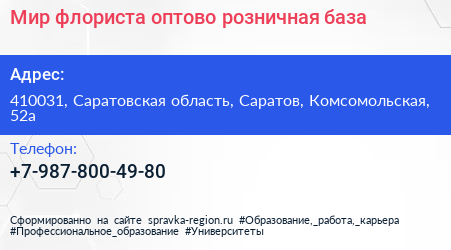 Мир флориста, оптово-розничная база по адресу 410031, Саратовская область, Саратов, Комсомольская, 52а в дальнейшем Организация, размещена в следующих категориях: