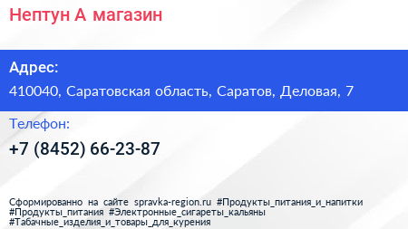 Нептун-А, магазин по адресу 410040, Саратовская область, Саратов, Деловая, 7 в дальнейшем Организация, размещена в следующих категориях: