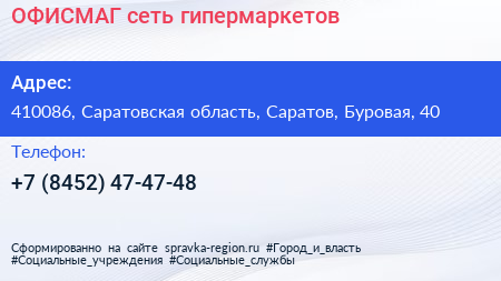 ОФИСМАГ, сеть гипермаркетов по адресу 410086, Саратовская область, Саратов, Буровая, 40 в дальнейшем Организация, размещена в следующих категориях: