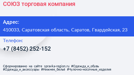 СОЮЗ, торговая компания по адресу 410033, Саратовская область, Саратов, Гвардейская, 23 в дальнейшем Организация, размещена в следующих категориях: