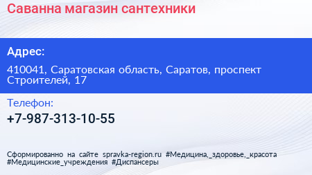 Саванна, магазин сантехники по адресу 410041, Саратовская область, Саратов, проспект Строителей, 17 в дальнейшем Организация, размещена в следующих категориях: