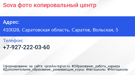 Sova, фото-копировальный центр по адресу 410028, Саратовская область, Саратов, Вольская, 5 в дальнейшем Организация, размещена в следующих категориях: