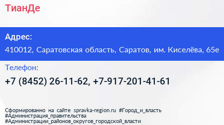 ТианДе по адресу 410012, Саратовская область, Саратов, им. Киселёва, 65е в дальнейшем Организация, размещена в следующих категориях: