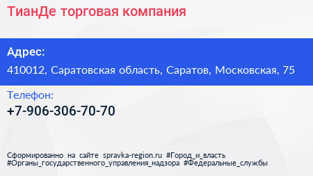 ТианДе, торговая компания по адресу 410012, Саратовская область, Саратов, Московская, 75 в дальнейшем Организация, размещена в следующих категориях: