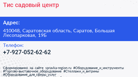 Тис, садовый центр по адресу 410048, Саратовская область, Саратов, Большая Лесопарковая, 19Б в дальнейшем Организация, размещена в следующих категориях: