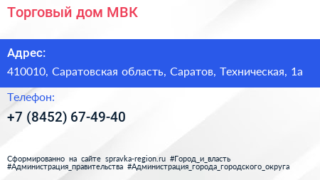 Торговый дом МВК по адресу 410010, Саратовская область, Саратов, Техническая, 1а в дальнейшем Организация, размещена в следующих категориях: