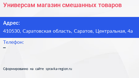 Универсам, магазин смешанных товаров по адресу 410530, Саратовская область, Саратов, Центральная, 4а в дальнейшем Организация, размещена в следующих категориях: