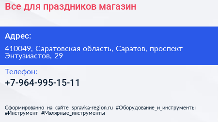 Все для праздников, магазин по адресу 410049, Саратовская область, Саратов, проспект Энтузиастов, 29 в дальнейшем Организация, размещена в следующих категориях: