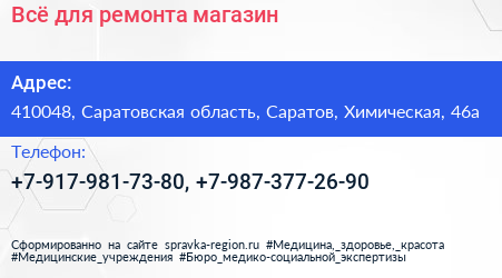 Всё для ремонта, магазин по адресу 410048, Саратовская область, Саратов, Химическая, 46а в дальнейшем Организация, размещена в следующих категориях: