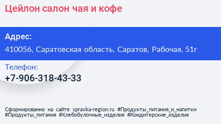 Цейлон, салон чая и кофе по адресу 410056, Саратовская область, Саратов, Рабочая, 51г в дальнейшем Организация, размещена в следующих категориях: