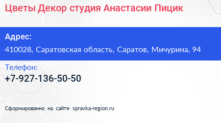 Цветы & Декор, студия Анастасии Пицик по адресу 410028, Саратовская область, Саратов, Мичурина, 94 в дальнейшем Организация, размещена в следующих категориях: