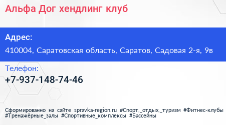 Альфа Дог, хендлинг клуб по адресу 410004, Саратовская область, Саратов, Садовая 2-я, 9в в дальнейшем Организация, размещена в следующих категориях: