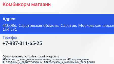Комбикорм, магазин по адресу 410086, Саратовская область, Саратов, Московское шоссе, 164 ст1 в дальнейшем Организация, размещена в следующих категориях:
