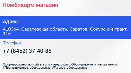Комбикорм, магазин по адресу 410064, Саратовская область, Саратов, Сокурский тракт, 11е в дальнейшем Организация, размещена в следующих категориях: