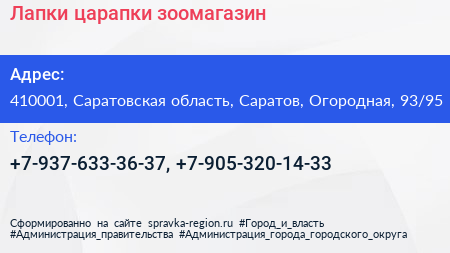 Лапки-царапки, зоомагазин по адресу 410001, Саратовская область, Саратов, Огородная, 93/95 в дальнейшем Организация, размещена в следующих категориях: