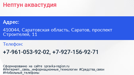 Нептун, аквастудия по адресу 410044, Саратовская область, Саратов, проспект Строителей, 11 в дальнейшем Организация, размещена в следующих категориях: