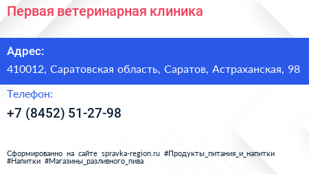 Первая ветеринарная клиника по адресу 410012, Саратовская область, Саратов, Астраханская, 98 в дальнейшем Организация, размещена в следующих категориях: