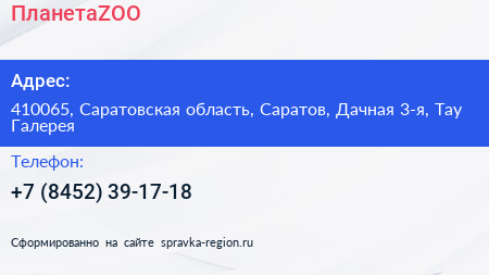 ПланетаZOO по адресу 410065, Саратовская область, Саратов, Дачная 3-я, Тау Галерея в дальнейшем Организация, размещена в следующих категориях: