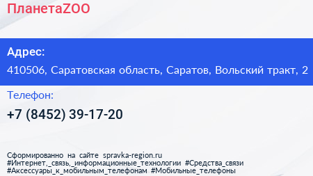 ПланетаZOO по адресу 410506, Саратовская область, Саратов, Вольский тракт, 2 в дальнейшем Организация, размещена в следующих категориях: