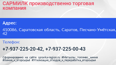 САРМИЛК, производственно-торговая компания по адресу 410086, Саратовская область, Саратов, Песчано-Умётская, 42 в дальнейшем Организация, размещена в следующих категориях: