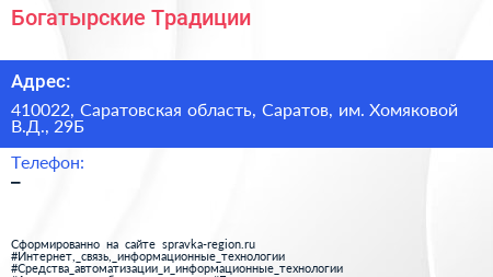 Богатырские Традиции по адресу 410022, Саратовская область, Саратов, им. Хомяковой В.Д., 29Б в дальнейшем Организация, размещена в следующих категориях: