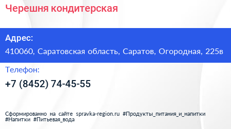 Черешня, кондитерская по адресу 410060, Саратовская область, Саратов, Огородная, 225в в дальнейшем Организация, размещена в следующих категориях: