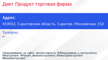 Диет-Продукт, торговая фирма по адресу 410012, Саратовская область, Саратов, Московская, 152 в дальнейшем Организация, размещена в следующих категориях: