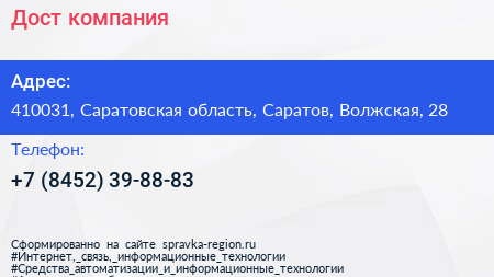 Дост, компания по адресу 410031, Саратовская область, Саратов, Волжская, 28 в дальнейшем Организация, размещена в следующих категориях: