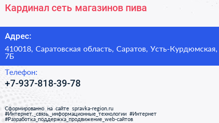 Кардинал, сеть магазинов пива по адресу 410018, Саратовская область, Саратов, Усть-Курдюмская, 7Б в дальнейшем Организация, размещена в следующих категориях: