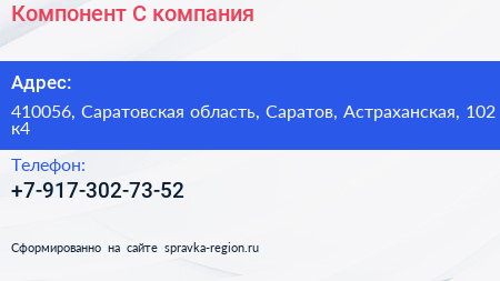 Компонент-С, компания по адресу 410056, Саратовская область, Саратов, Астраханская, 102 к4 в дальнейшем Организация, размещена в следующих категориях: