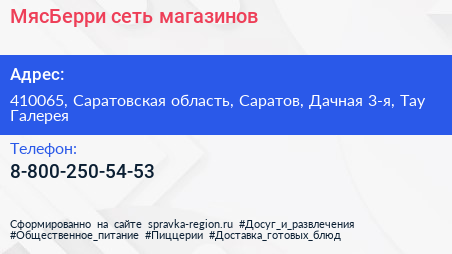 МясБерри, сеть магазинов по адресу 410065, Саратовская область, Саратов, Дачная 3-я, Тау Галерея в дальнейшем Организация, размещена в следующих категориях: