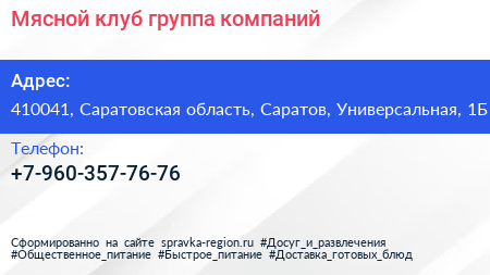 Мясной клуб, группа компаний по адресу 410041, Саратовская область, Саратов, Универсальная, 1Б в дальнейшем Организация, размещена в следующих категориях: