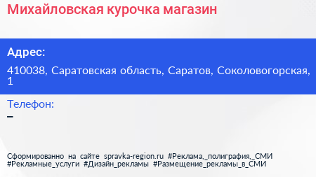 Михайловская курочка, магазин по адресу 410038, Саратовская область, Саратов, Соколовогорская, 1 в дальнейшем Организация, размещена в следующих категориях: