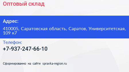Оптовый склад по адресу 410005, Саратовская область, Саратов, Университетская, 109 к7 в дальнейшем Организация, размещена в следующих категориях:
