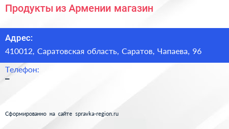 Продукты из Армении, магазин по адресу 410012, Саратовская область, Саратов, Чапаева, 96 в дальнейшем Организация, размещена в следующих категориях: